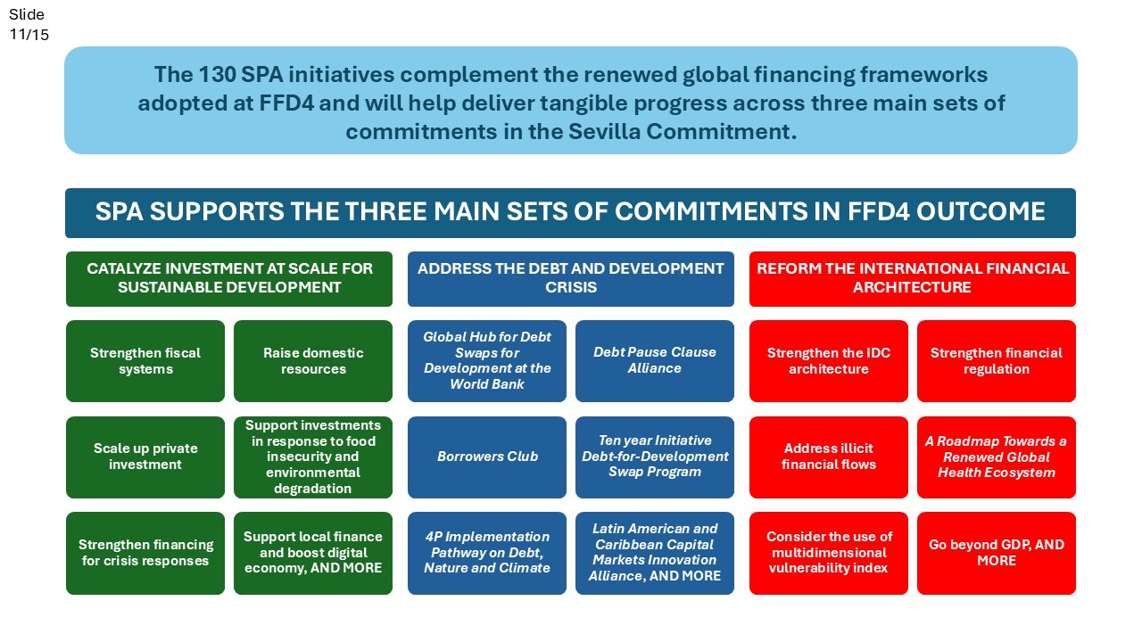 In the Sevilla Platform for Action, coalitions of countries and stakeholders have put forward 130 high-impact initiatives to begin implementation of the Sevilla Commitment on day one. These initiatives complement the renewed global financing frameworks adopted by world leaders at the fourth International Conference on Financing for Development and will help deliver tangible progress to finance our future, across the three main sets of commitments of the Commitment: